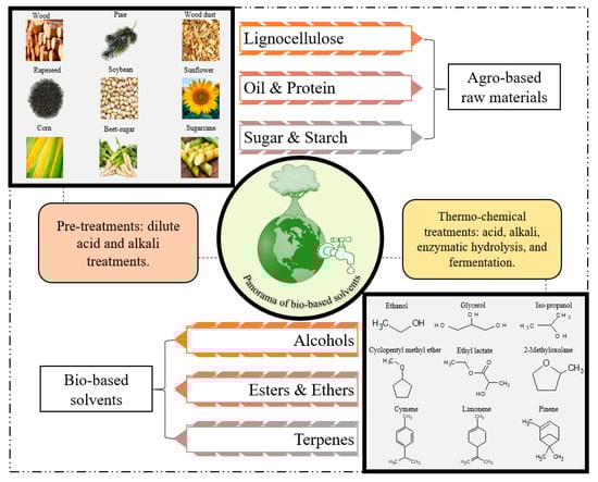 Bio-based solvents, as the name signifies, are produced from agricultural biomass. Based on the agricultural origin of the biomass utilized for the production of these solvents they can be predominantly classified into four categories: (a) lignocellulosic; (b) sugar and starch; (c) protein & oil based and (d) other forestry and food wastes. The solvents obtained from these categories can be further classified based on their functional groups (esters, ethers, terpenes, and alcohols) or based on the petroleum-based solvent they were intended to replace (Figure 4). In order to be identified as a green solvent, the solvent should ideally fulfil the twelve criteria proposed in the principles of green chemistry. There are certain parameters and pre-requisites that a typical characteristic solvent should possess to qualify as a green solvent. To name a few, the solvent should be from renewable feedstocks, recyclable using eco-efficient treatments, exhibit similar properties as common solvents, high boiling point and low vapour pressure and enhanced biodegradability under normal environmental conditions, etc. [94,95]. Production or synthesis of bio-based solvents or green solvents it in itself should not have a negative environmental impact.