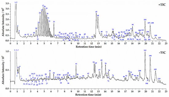 Total ion current chromatogram (TIC) of Sparassis crispa extracts in positive and negative ESI modes.