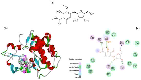 To further understand the interaction between drugs and targeted enzymes, the confirmations of small molecules bonded into the “active cavity” of proteins and their interaction patterns with amino acid residues of protein was simulated via Discovery Studio Visualizer 4.0. Taking the active compound sparoside A (Figure 2a) as an example, as shown in Figure 2b, the small molecule was “curling up” in the protein active site of Fyn, which was unambiguously presented in the graphical molecular ribbon model. It was found to form five hydrogen bonds with five residues in chain X, including with Leu17 (4.6 Å) on hydroxyl, with Ser89 (3.9 Å) on carboxyl, with Thr82 (4.0 Å), Glu83 (4.3 Å), and Met85 (4.0 Å) on glucosyl group (Figure 2c). The other intermolecular interactions were also depicted, which were included but not confined to electrostatic force and van der Waals force. It was that all these interactions contributed to the high anti-inflammatory activity of sparoside A.