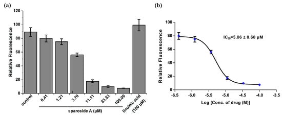 To investigate the anti-inflammatory effects of those predicted hits, Ca2+ mobilization in Furo-2AM loaded RBL-2H3 cells was measured. As shown in Figure 3a, compared to the control vehicle, sparoside A (100 μM) significantly decreased intracellular Ca2+ concentration, while linoleic acid slightly increased it. This result suggested that sparoside A was a positive inhibitor of SFKs, considering by combining the aforementioned docking results. But linoleic acid was probably an agonist of SFKs, although it owned strong affinity with SFKs as the inhibitors. The inhibitors and agonists couldn’t be distinguished by virtual screening. In the next experiment, it was found that sparoside A dose-dependently decreased intracellular Ca2+ mobilization, and its IC50 value was 5.06 ± 0.60 μM in six replicates (Figure 3b).