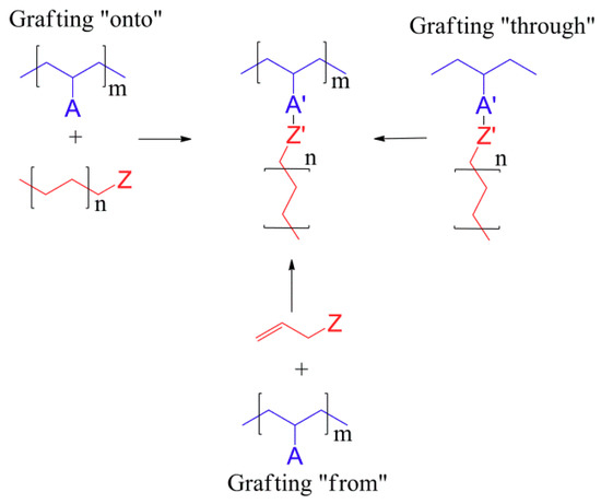 Outline of the three main approaches to the synthesis of graft polymers. Based on [4]. The A and Z groups are used to indicate the reactive groups in each type of reaction. The example of polyethylene grafting was selected rather than the species reported in this work in order to maintain clarity and focus on the reactions that may be used for obtaining these macromolecules.