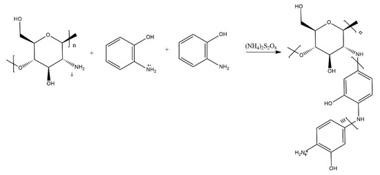 Abd El-Salam et al. [7] report the grafting of poly(2-hydroxyaniline) on chitosan (Scheme 2). The authors investigated the effect of different copolymerisation conditions on the properties of their copolymers, confirming their structure via infrared (IR) spectroscopy. The mechanism and kinetics of the grafting copolymerisation reaction are discussed in great detail. The samples of the copolymers were investigated in terms of their adsorption parameters. These materials show favourable adsorptive properties towards removing transition metals from aqueous media. It however remains unclear whether the materials are true copolymers or a blend of homopolymers produced via polymerisation of the monomer adsorbed on chitosan particles.