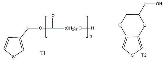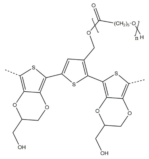 Another interesting approach to thiophene-based copolymers was reported by Molina et al. [21], who synthesised a macromonomer of polycaprolactone equipped with a 3-thienyl end group (T1), which was electrochemically polymerised with hydroxymethyl-3,4-ethylenedioxythiophene (T2) (Scheme 13). Expectedly, the T1 macromonomer could not be polymerised, but T2 readily produced a homopolymer. The structure of this homopolymer, as well as that of the copolymer of T1 and T2 was identified by IR spectroscopy. The homopolymer and copolymer were tested in terms of their biocompatibility, with the introduction of T1 into the structure of the copolymer considerably reducing the cytotoxicity of the material, making it a potential candidate for producing implantable dopamine sensors.
