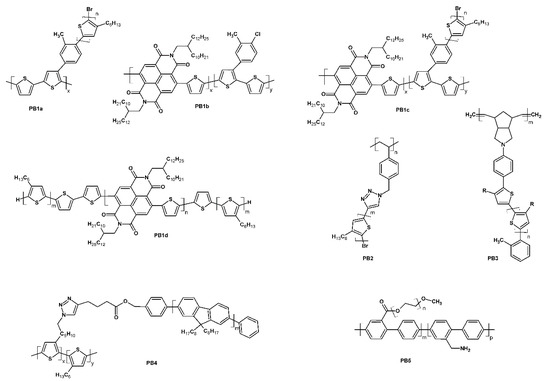 Wang et al., who earlier reported the synthesis of a series of conjugated graft copolymers [24,25,26,27] consisting of different conjugated cores, with poly(3-hexylthiophene) (P3HT) arms being grafted onto thiophene (Th) moieties of the cores, recently investigated a number of these copolymers (Scheme 16 PB1a–d) in prototype organic field-effect transistors (OFETs) and organic solar cells (OSCs) [28]. The performance of most of these donor–acceptor (D–A) copolymers in OFET configurations was relatively poor, exhibiting low ON/OFF current ratios and acceptable to extremely high threshold voltages (in the range of ~2–60 V). The former may be due to the balanced hole and electron mobility of these systems, as the best ON/OFF ratios of 1.14 × 102 and 3.82 × 106 were obtained respectively for the purely hole-transporting copolymer PB1a and for the mostly electron-transporting copolymer PB1b. The investigated compounds were mixed with both poly(3-hexylthiophene) and a fullerene derivative (PC61BM) and used in bulk hetero-junction (BHJ) OSCs, achieving power conversion efficiency (PCE) values of up to 2.27%. However, it is worth noting that in this case PB1b was used as a surfactant for the tried and true P3HT/PC61BM system. Unfortunately, the authors did not include the investigation of an OSC containing only P3HT/PC61BM and lacking the PB1b surfactant in the manuscript, making the impact of this addition on the power conversion efficiency of the OSC unclear.