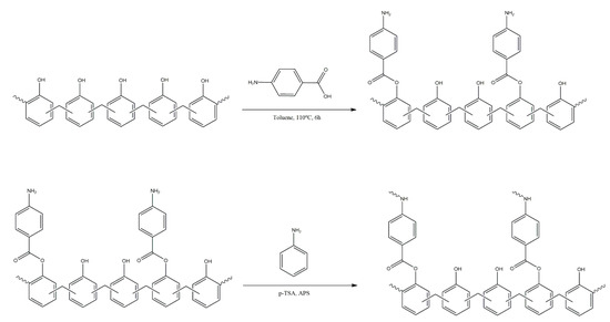 In turn, Rezaei et al. [34] focused on the development of a new adhesive, by grafting PANI onto novolacs (Scheme 19). Interestingly, grafting was performed by treating the hydroxyl groups of novolacs with p-aminobenzoic acid, introducing amine groups into the novolac chains, which were used as grafting sites for PANI. The structure of the copolymers was confirmed by IR and NMR spectroscopy, although no quantitative investigation, particularly into the grafting density, was included in the manuscript. In terms of the mechanical properties, the copolymers showed properties similar to those of novolacs, with aniline units curiously causing a decrease in both the tensile strength and elasticity (elongation at break) of the materials. Interestingly, grafting PANI onto novolacs appeared not to influence the conductivity of PANI significantly, with the copolymers and pure PANI showing conductivity values on the same order of magnitude. As such, the copolymers are an interesting material choice for conductive adhesives, with a multitude of potential applications.