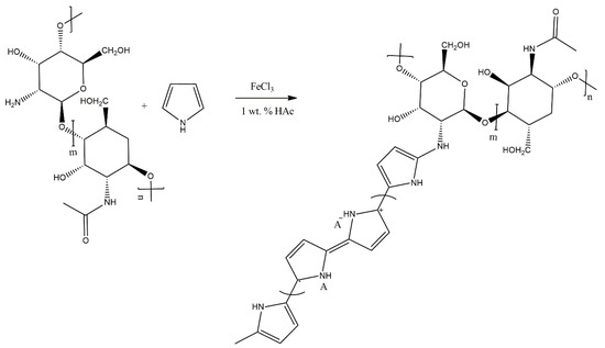 Cabuk et al. [37] have also undertaken the subject of grafting chitosan with conducting polymers, but opted to graft it with PPy (Scheme 21). The copolymer was investigated in terms of its electrokinetic properties in aqueous media, showing a shift of the ζ-potential of the copolymer towards more positive values than in the case of PPy. Suspensions of the copolymer in silicone oil were found to show some electrorheological activity, exhibiting viscoelastic behaviour and showing a reversible nonlinear deformation when placed in an electric field. As such, the graft copolymer may have potential as a material for vibration damping applications.