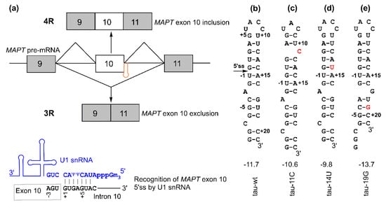 An RNA hairpin structure at the tau pre-mRNA exon 10 5′ splice site (5′ss, located at the 3′ end of exon 10 and the 5′ end of intron 10, Figure 1) may regulate the alternative splicing of exon 10 and thus the ratio of 4R/3R isoforms [,,,,,,]. The formation of this hairpin masks the 5′ss, thus inhibiting its recognition by U1 small nuclear ribonucleoprotein (U1 snRNP, Figure 1a), which is a key initial step in pre-mRNA splicing [,,]. Point mutations in the hairpin region affect its stability by introducing mismatched base pairs or by structural rearrangement within the hairpin [,,,,,,,,].