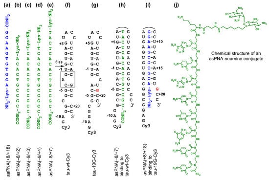 Sequences and structures of PNAs and RNAs. (a–e) PNAs studied in this paper. (f,g) Cy3-labeled tau pre-mRNA wild-type and mutant +19G RNA hairpin constructs used for nondenaturing PAGE assay. The gray box represents the A bulge structure, resulting in the formation of top and bottom stems. (h) A complex formed between antisense PNA asPNA(−8/+7) and hairpin tau-wt-Cy3. (i) A complex formed between asPNA(+8/+18) and hairpin tau-19G-Cy3. (j) Chemical structure of a PNA–neamine conjugate. The PNA is an 8-mer and is shown for illustration purposes. The Lys residue (attached with neamine) has an L configuration.