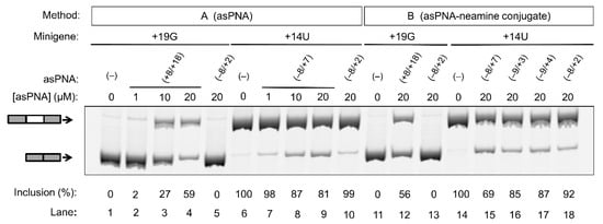 We tested the cell culture activities of the asPNAs in modulating the tau pre-mRNA minigene splicing for the +19G and +14U mutants, which exhibited overly enhanced exclusion and inclusion of exon 10, respectively. It has been previously reported that PNAs may be delivered into cells by incorporating PNAs into liposome structures []. In our study, HEK293T cells were cotransfected with the minigenes and asPNAs using the commercially available X-tremeGENE 9 DNA Transfection Reagent (a nonliposomal multicomponent reagent, method A).