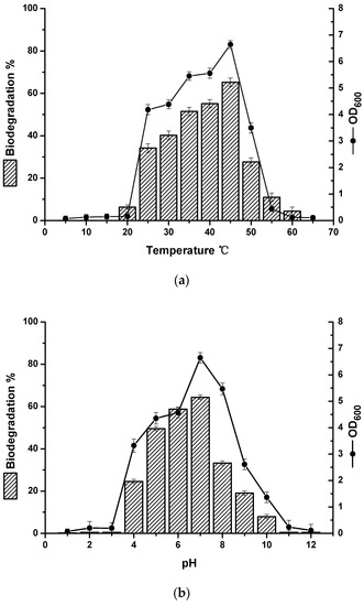 The optimum temperature for the growth of strain BL-27 strain and degradation of crude oil was 45 °C, with an adaptive range of temperatures from 25 to 50 °C (Figure 2a).