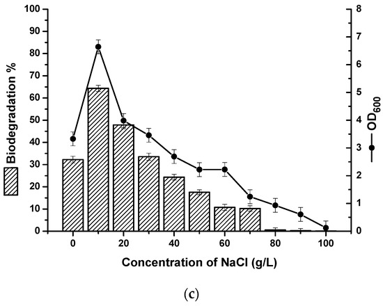 Effects of (a) temperature (5–65 °C) at a pH of 7.0 and salinity of 10 g/L; (b) pH (1.0–12.0), at a temperature of 45 °C, and salinity of 10 g/L; and (c) salinity (0–100 g/L) at a temperature of 45 °C and pH of 7.0 on the cell growth of B. subtilis strain BL-27 in LB medium and biodegradation of crude oil in MSM medium at 150 rpm by the strain BL-27 (6%, v/v).