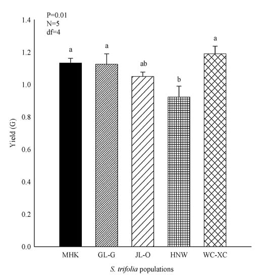 Extract yield (g) obtained from different populations of S. trifolia. Values are represented as the mean ± standard error. The same letters on bars indicated that the values are not significantly different according to Tukey’s HSD at the p > 0.05 level. N = number of replications; df = degree of freedom.
