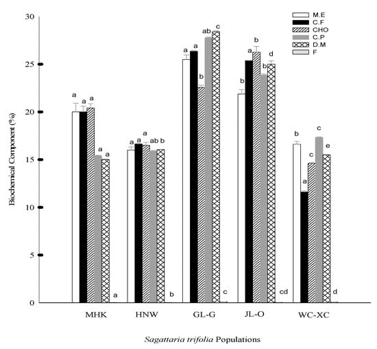 Biochemical composition of S. trifolia. Values are represented as the mean ± standard error. The same letters on bars indicated that the values are not significantly different according to the Tukey’s HSD test at p ≤ 0.05. M.E (mineral element); C.F (crude fibre), CHO (carbohydrates), C.P (crude protein), D.M (dry matter/ash), F (Fats); MHK (Meihekou), GL-G (Jilin), JL-O (Siping), HNW (Harbin), WC-XC (Wuchang).