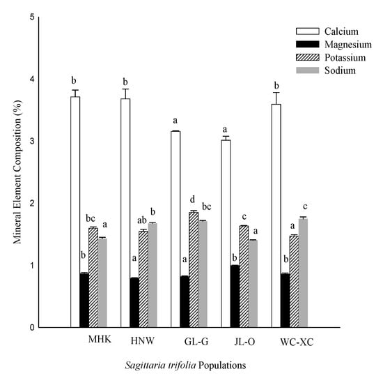 Mineral elements (%) in S. trifolia leaves. Values are represented as the mean ± standard error. The same letters within a column indicate that the mean values are not significantly different according to the Tukey’s HSD test at p ≤ 0.05. MHK (Meihekou), GL-G (Jilin), JL-O (Siping), HNW (Harbin), WC-XC (Wuchang).