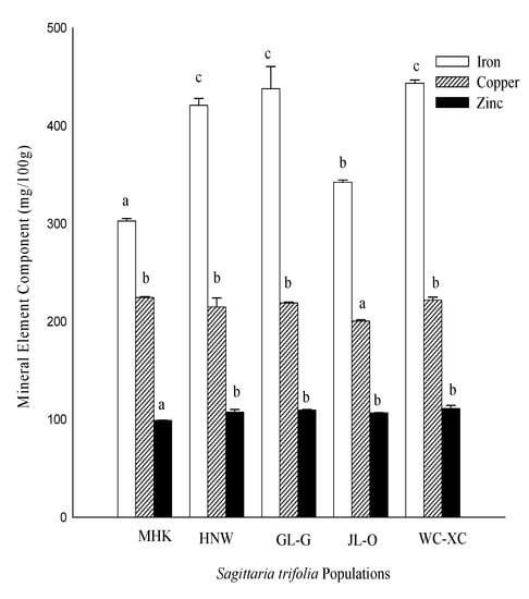 Mineral element (mg/100 g) in S. trifolia leaves. Values are represented as the mean ± standard error. The same letters within column indicates that the mean values are not significantly different according to the Tukey’s HSD test at p ≤ 0.05. MHK (Meihekou), GL-G (Jilin), JL-O (Siping), HNW (Harbin), WC-XC (Wuchang).