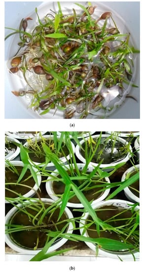 Sagittaria trifolia: (a) newly sprouted corms; (b) plants at 6–7 leaves stage.