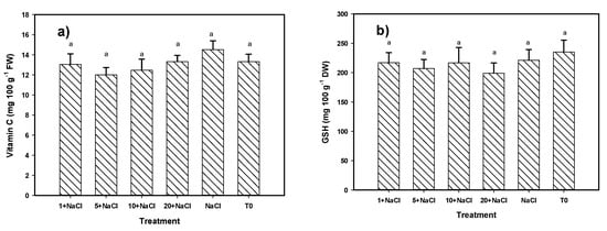 - Hernández-Fuentes, A.D.; López-Vargas, E.R.; Pinedo-Espinoza, J.M.; Campos-Montiel, R.G.; Valdés-Reyna, J.; Juárez-Maldonado, A. Postharvest behavior of bioactive compounds in tomato fruits treated with Cu nanoparticles and NaCl stress. Appl. Sci. 2017, 7, 980. [Google Scholar] [CrossRef]