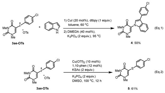 Application studies of the obtained uracil-iodonium(III) salts 3 were then undertaken to exemplify their utility in several reactions. The selected examples are shown in Scheme 5. Thus, the Cu(I)-catalyzed sequential C−H and N−H arylation of indole [21] by iodonium triflate 3ae-OTs produced the indoyl uracil 4 in moderate yield (Scheme 5, Equation (1)). On the other hand, Cu(II)-catalyzed sulfide construction through a sulfur-iodine exchange protocol [32] of iodonium(III) triflate 3ae-OTs with potassium thioacetate generated 5 in 61% yield (Equation (2)).