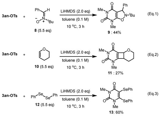 Having established the [4 + 2] cycloaddition conditions using the 3an-OTs above, we were able to extend the reactivity of the uracil iodonium(III) salts to other types of cycloadditions. The representative results are given in Scheme 6. Thus, the reaction of 3an-OTs with N-tert-Butyl-phenyl nitrone 8 [34] afforded a [3 + 2] annulated product 9 (Equation 1). The cycloaddition of 3,4-dihydro-2H-pyran 10 [35] as an alkynophile yielded the [2 + 2] annulated product 11 (Equation 2). When diphenyldiselenide 12 [36] was subjected to the reaction conditions, σ-bond insertion occurred and the 5,6-difunctionalized product 13 was obtained in a moderate yield (Equation (3)).