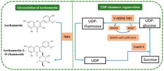 The methods of extraction for the isorhamnetin-3-O-rhamnoside have been reported [10,11,12,13,14]. These methods are mainly based on the chemical reagents and plants resources and could be unfriendly to the environment. What’s worse, they are limited by the low concentration of product and complex secondary metabolites in the extracts. In comparison with chemical methods, enzymatic methods have many potentials for the isorhamnetin-3-O-rhamnoside production because of their high efficiency and environmental compatibility. The research about biological synthesis of isorhamnetin 3-O-glucoside using engineered glucosyltransferase has been reported [15]. The glycosyltransferases, which can transfer sugar molecules in their activated forms to acceptors, were considered to catalyze the most of glycosylation reactions in nature [16,17,18,19,20]. However, glycosylation reactions were limited by sugar donors. Sugar nucleotides are most commonly used as sugar donors and the uridine diphosphate (UDP) sugars are the largest group of nucleotide sugars. Nevertheless, most UDP sugars, especially UDP-rhamnose, which can be attached to small molecules such as secondary metabolites to improve their solubility, stability, and pharmacological properties [21,22,23,24], are expensive and hard to acquire. In our previous work, a cofactor self-sufficient UDP-rhamnose regeneration system has been established. This system can synthesize UDP-rhamnose from sucrose, Nicotinamide adenine dinucleotide (NAD+), and UDP by the catalysis of UDP-rhamnose synthase (VvRHM-NRS, cloned from Vitis vinifera) coupling with Glycine max sucrose synthase (GmSUS) and can be applied to the glycosylation of flavonoids by using the A. thaliana glycosyltransferase (78D1) [25].