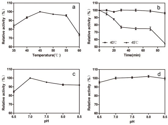 The effects of pH and temperature on the activity and stability of 78D1. (a) Effects of temperature on 78D1 activity. (b) The thermostability of 78D1. (c) Effects of pH on 78D1 activity. (d) Effects of pH on 78D1 stability. The initial activity was defined as 100%.