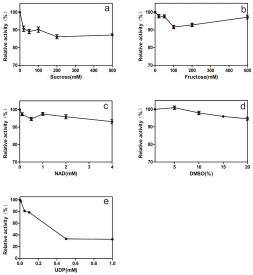 Effects of sucrose (a), fructose (b), NAD+ (c), DMSO (d), and UDP (e) on the activity of purified 78D1. The initial activity was defined as 100%.