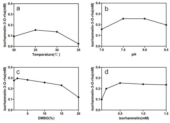 Optimization of bioconversion conditions for isorhamnetin-3-O-rhamnoside production by synergistic catalysis. Effects of temperature (a), pH (b), DMSO (c), and isorhamnetin (d) concentration on production. Values shown are the mean of duplicate experiments, and the variation about the mean was below 5%.