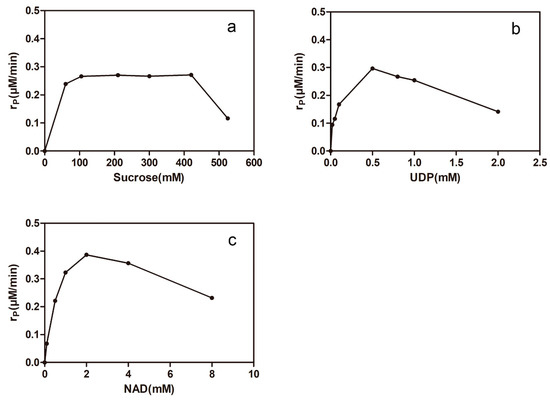 The isorhamnetin-3-O-rhamnoside production rate was measured when the initial concentrations of sucrose (60–525 mM; 0.5 mM UDP; 1 mM NAD+), UDP (0.02–2 mM; 300 mM sucrose; 1 mM NAD+), and NAD+ (0.1–8 mM; 0.5 mM UDP; 300 mM sucrose) were varied, respectively. The results are shown in Figure 7. The isorhamnetin-3-O-rhamnoside production rate was significantly decreased as the concentration of sucrose was increased from 420 mM to 525 mM (Figure 7a). UDP is a complex factor of synergistic catalysis, which is not only essential for GmSUS but is also a potent inhibitor of 78D1. The isorhamnetin-3-O-rhamnoside production rate was increased approximately three-fold when the concentration of UDP was increased from 20 to 500 μM and was decreased by half when the concentration of UDP exceeded 0.5 mM (Figure 7b). The isorhamnetin-3-O-rhamnoside production rate was also increased approximately six-fold when the concentration of NAD+ was increased from 0.1mM to 2 mM (Figure 7c). The production rate decreased by half when the concentration exceeded 2 mM because of the fact that NAD+ was also a potential inhibitor of the activity of VvRHM-NRS and high concentration of NAD+ could inhibit nicotinamide adenine dinucleotide (NADH) to serve as the cofactor of VvRHM-NRS. Based on the conversion efficiency, 400 mM sucrose, 0.5 mM UDP, and 2 mM NAD+ were used for the next experiments.