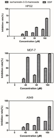 In this paper, we evaluated antiproliferative activities of isorhamnetin-3-O-rhamnoside and cisplatin (DDP) against HepG2, MCF-7, and A549 cells using the Thiazolyl Blue Tetrazolium Bromide (MTT) assay. The cell proliferation inhibition rates are shown in Figure 9. There is no inhibiting effect on the HepG2, MCF-7, and A549 cells when the isorhamnetin-3-O-rhamnoside and DPP do not exist. Moreover, the isorhamnetin-3-O-rhamnoside and DPP had lower inhibitory effects on human hepatoma cell line HepG2 and human lung cancer cell line A549. 160 μM isorhamnetin-3-O-rhamnoside showed strong inhibitory effects on human breast adenocarcinoma cell line MCF-7 proliferation (inhibition rate = 51%), though the same concentration DPP (positive control) showed the strongest inhibitory effects on human breast adenocarcinoma cell line MCF-7 proliferation (inhibition rate = 97%).
