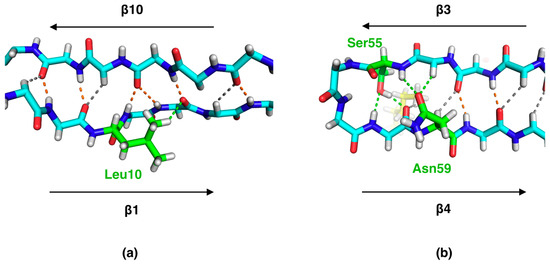 At the C-terminal end of strand β1, between strands 2 and 10, the strand turns away, but the β-sheet-like interactions are continued further with strand 10 through an extended conformation of the Asn15 side chain (Figure 3a). The side chain makes N–H...O and C–H...O bonds with the carbonyl oxygen of Val123 on strand β10. The sequence alignment of all human FABP family members, 12 in total, highlights that Asn15 is fully conserved, apart from human FABP5, in which it is a glycine [14]. This observation suggests that a similar “extension” of strand β1 may be a common property of FABP family members. Another location of C–H...O bonds involving side chains concerns tight β turns (Figure 3b). While the backbone carbonyl group of residue i H-bonds to the NH group of residue i+3, it also makes a C–H...O bond to the side chain of the same residue (i+3) in approximately half of the turns. In the remaining cases, the carbonyl group has a different conformation and contacts a water molecule in addition to NH(i+3).