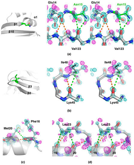 Details of protein backbone interactions from sub-atomic resolution electron density maps. Carbonyl groups in d-P2 secondary structures regularly interact with side-chain C–H groups through C–H...O hydrogen bonds. The 2Fo–Fc map (cyan) in each panel is contoured at 4.0 σ, and the Fo–Fc map (magenta) at 2.7, 2.5, 2.5, and 2.2 σ for panels (a)–(d), respectively. The maps were calculated after refining the structure without hydrogen atoms. Main-chain hydrogen bonds are shown in orange, and hydrogen bonds involving side chains are shown in green. (a) Left: Asn15 (green) is located at the C-terminal end of strand β1, just before helix α1 starts. Right: Stereo view of the interactions between the Asn15 side chain and strand β10. (b) The β2–β3 turn presents Cβ–H…O hydrogen bonding between Ile48 (green in the left panel) and the main-chain carbonyl of Lys45. (c) C–H…O bonding within helix α1, involving the side chain of Met20. (d) At the end of helix α1, Leu23 caps the helix through a double C–H…O interaction to the previous turn of the helix.