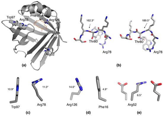 Unconventional conformations are revealed at ultrahigh resolution. (a) Location of the distorted side chains in the d-P2 3D structure. Note how Arg78/Trp97 and Phe16/Arg126 are in close contact. (b) Peptide bond distortion on both sides of Thr80 leads to its insertion deeper into the structure, interacting with Arg78 and Trp97. The ω angles for the two adjacent bent peptide bonds are shown from two slightly different views. (c) Packing of Trp97 against Arg78. Both side chains are strong geometric outliers due to non-planarity. (d) Arg126 packs against Phe16, and both residues show loss of planarity in the side chain. (e) Arg52 is twisted, apparently to optimize its conformation between two Glu residues.
