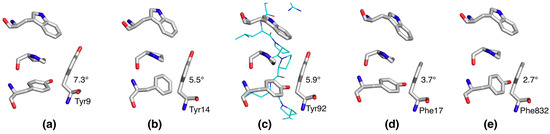 As small proteins with a relatively large proportion of conserved aromatic residues, Src homology 3 (SH3) domains are represented in the PDB by many atomic-resolution structures. We looked at five SH3 domain structures, refined at < 1.0 Å resolution. The structures used were PDB entries 1zuu (0.97 Å), 1tg0 (0.97 Å), 4hvw (0.98 Å), 2g6f (0.92 Å), and 2o9s (0.83 Å) [23,24,25,26,27]. A conserved aromatic planarity outlier is present in all structures analyzed, close to the peptide ligand-binding site; bending was most severe for a Tyr, but also the Phe residues at this position showed the same phenomenon (Figure 5). This finding strongly suggests functional relevance for this structural anomaly in SH3 domains.