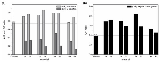 Although, by using EDC/NHS coupling, the selectivity of the reaction can be displaced towards N-acylation, it is worth noting that all derivatives synthesized with this system exhibited lower substitution degrees (C/R, understood as a relative amount of alkyl LA chains grafted, Figure 2b) compared to derivatives obtained with EDC. When the chitosan molecules are protonated (as in the reaction media employed), it can be surmised that the EDC-active ester is able to react either with amino or hydroxyl groups (Scheme 2b, major and minor reaction pathway) while, as stated before, for the NHS-ester, O-acylation is not the preferential reaction path (Scheme 2b, minor reaction pathway). Considering the substitution place and as observed in Figure 2, this can be corroborated as the O-acylation reaction (A/R ratio) exceeds the N-acylation (B/R ratio) for derivatives synthesized with the EDC coupling system (derivatives 1–4a) in contrast to the ones obtained using EDC/NHS.