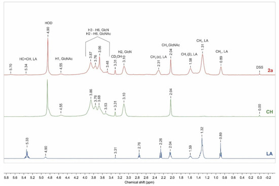 The compliance of the presented NMR analysis proved the overlapping of CH2 α, LA signals concerning an ester or amide group (Figure 3, derivative 2a, δ~2.31 ppm) which leads us to a conclusion that the calculations of substitution degree for N- and O-acylation can produce incorrect values.
