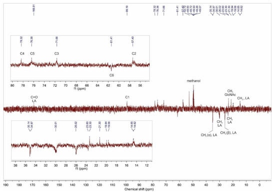 The 13C DEPT–135 NMR spectrum of the product 2a is given in Figure 4. Six signals of chitosan macromolecule at δ 99.3 ppm (C1), 78.3 ppm (C4), 76.4 ppm (C5), 71.7 ppm (C3), 61.4 ppm (C6) and 57.4 ppm (C2), are attributed to the glucopyranose carbons of the GlcN and GlcNAc units. The appearance of new signals was observed at δ 168.9 ppm and also in the range δ 36–14 ppm. The first one is assigned to the carbonyl group, and the signals in the high field region come from methyl and methylene carbons in LA moiety. These results are consistent with the 1H NMR analysis.