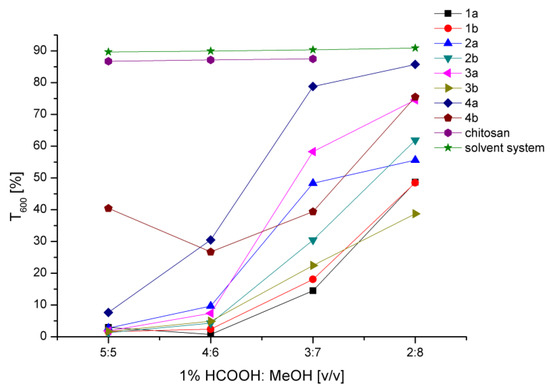 Solubility study was performed by transmittance spectra analysis (UV-Vis) at the selected wavelength and analyzed in terms of the transparency of the solutions—which is indicative of macromolecules’ conformation [37,38,39,40]. The transparency results of chitosan and derivative solutions with different 1 wt% formic acid/methanol volume ratios are presented in Figure 6. For chitosan solution, the addition of methanol did not change transparency up to the 3:7 (v/v) ratio. Due to the chitosan gel-like structure observed at 2:8 (v/v) ratio, the transparency measurement for that system could not be performed. Regarding the derivatives, the addition of methanol to the acidic aqueous solution significantly improved their transparency. Thus, changing the solvent character to make it less aqueous allowed the hydrophobic fatty acid chains to interact with the solvent mixture, enhancing the solubility of the amphiphilic macromolecules which are non-soluble in the purely aqueous solution. The derivative 4b exhibited a high degree of solubility even at a 5:5 (v/v) ratio, since it is characterized by the lowest substitution degree and thus its solution behavior is dominated by chitosan.