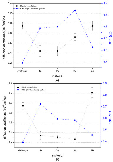 For the chitosan, the translational diffusion coefficient was found to be 0.945 μm2/s, whereas in 1 wt% acetic acid solution, the diffusion coefficient was 1.27µm2/s (data not included in the graph). These results confirmed the previous observation that solvent strongly influences the spatial orientation of macromolecules by changing their hydrodynamic radius, which arises from different polymer–polymer and polymer–solvent interactions. It is well established that chitosan can behave like a highly rigid [41,42] or semi-flexible polymer [6,43], depending on the ionic strength of the solution. From a general viewpoint, we have observed that with regards to the measured diffusion coefficient values, chitosan derivatives behave differently than unmodified chitosan in solution. For the derivatives obtained only with EDC, an increasing amount of grafted linoleic acid (derivatives 1a–3a) raised the diffusion coefficient, but the values were still significantly lower compared to the ones for unmodified chitosan (Figure 7a). These results suggest that the spatial conformation in the selected solvent system (1 wt% formic acid in water/methanol, 2:8 v/v) for the obtained derivatives, restricts the Brownian motions in solution, due to the long alkyl chains grafted on chitosan macromolecules. Only for the derivative 4a, the amount of grafted linoleic acid was not sufficient to cause a/the different orientation of macromolecules in solution and therefore, its diffusion coefficient was comparable to the value obtained for unmodified chitosan. We could simply assume that the observed lower diffusion coefficients resulted in a larger hydrodynamic radius for the derivatives, which is consistent with the Stokes–Einstein equation for the diffusion coefficient of particles undergoing Brownian motion in a quiescent fluid at the uniform temperature [44].