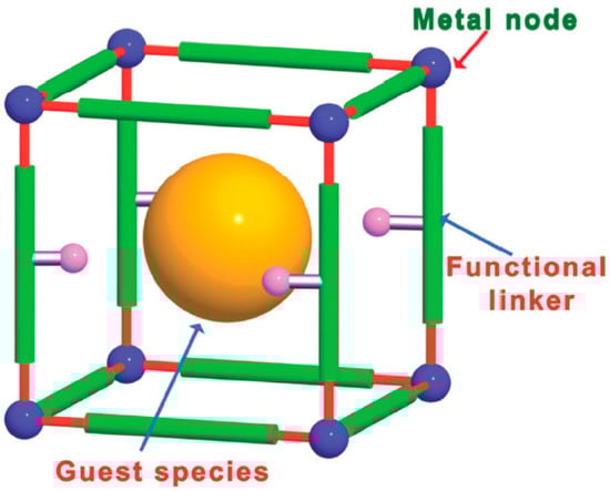 Possible location of active sites in MOFs, including metal nodes, functionalized organic linkers, and guest species such as MNPs in the pores. Reproduced with permission from [24].