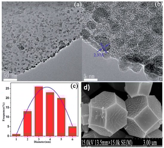 TEM images (a,b) and Pd NPs size distribution (c) for Pd(0.5wt%)/DUT-67. (d) SEM image of DUT-67. Reproduced with permission from [53].