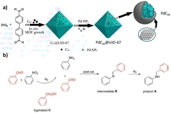 (a) Schematic illustration for the sequential synthesis of C60@UiO-67 and PdC60@UiO-67. (b) Synthesis of secondary N-benzylanilines through hydrogenation of nitrobenzene and reductive amination of benzaldehyde. Reproduced with permission from [54].