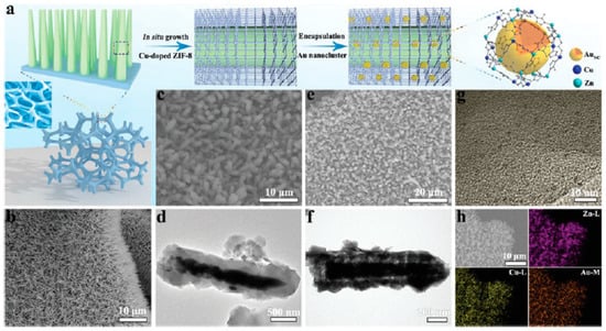 (a) Schematic diagram illustrating the synthetic procedures of the catalyst samples. (b) The SEM image of ZnO NRs. (c) The SEM image of ZIF-8(Cu) nanorod arrays (NRAs). (d) The TEM image of ZIF-8(Cu) NRAs. (e) The SEM image of AuNC@ZIF-8(Cu) NRAs (NC: nanoclusters). (f) The TEM image of AuNC@ZIF-8(Cu) NRAs. (g) The HRTEM image of AuNC@ZIF-8(Cu) NRAs. (h) The element mapping of Zn, Cu and Au of AuNC@ZIF-8(Cu) NRAs. Reproduced with permission from [57].