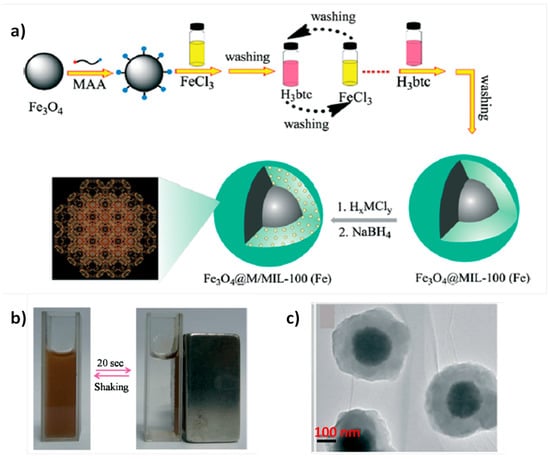 Catalyst recovery and recycling is one of the important issues in the development of heterogeneous catalysts for industrial applications. Traditionally, filtration or centrifugation are the most widely used methodologies for the separation of the catalyst from batch reactors. Other possibility consists in the preparation of a magnetic catalyst that can be easily recovered by applying weak magnetic fields. In one example of this strategy, a core–shell material composed by magnetite NPs (core) surrounded by MIL-100(Fe) solid (shell) loaded with noble NPs has been prepared and employed as magnetically recoverable catalyst to effect the reduction of aromatic nitro compounds to their corresponding amines by using NaBH4 as reducing agent [58]. Figure 7 shows the preparation of the catalyst by obtaining in a first step the Fe3O4 core (~250 nm) functionalized with mercaptoacetic acid (MAA) and, then, a MIL-100(Fe) shell was prepared via layer-by-layer assembly process that allows to control the shell thickness from about 25 to 100 nm. By means of the deposition-reduction method with NaBH4, Au (2.0 ± 0.2 nm), Pd (2.2 ± 0.2 nm) or Pt (1.9 ± 0.2 nm) NPs were incorporated within the mesopores of the MIL-100(Fe) shell in the Fe3O4@MIL-100(Fe) composite. Fe3O4@MIL-100(Fe)-Pt material exhibited the highest activity for 4-nitrophenol reduction to 4-nitroaniline by NaBH4 with an apparent first-order rate constant of 2.58 min−1. This value is higher than those previously reported for other noble metal-based catalysts such as AucoreAgshell-ZIF-8 [82], MIL-100(Fe) [80], or magnetic double-shell Fe3O4@TiO2/Au@Pd@TiO2 microsphere (Fe3O4 core and double TiO2 shells with Au and Pd NPs) [83]. The scope of the reaction was studied by reducing a variety of nitrophenol derivatives (TOF 450–3573 h−1), nitroaniline compounds (1297–2091 h−1) and p-nitrophenylhydrazine (TOF 563 h−1). The most active Fe3O4@MIL-100(Fe)-Pt catalyst was reused ten consecutive times without loss of the catalytic activity. It should be noted that after each catalytic reaction the catalyst recovery was done using a magnet and, then, washed with ethanol and dried before a new catalytic cycle. ICP-AES analysis of the liquid phase did not detect the presence of Pt, while nearly 80% of the initial Pt content was maintained in Fe3O4@MIL-100(Fe)-Pt after ten cycles.