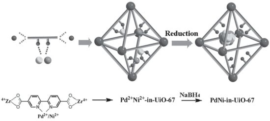 Encapsulation of PdNi NPs in UiO-67(Zr) via the in situ metal precursor incorporation method. The assembly of MOFs and incorporation of metal precursors are performed in one step. Reproduced with permission from [61].