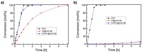 Preformed core–shell PdPt and RuPt NPs have been embedded into chemically robust UiO-66(Zr) MOFs and their activity was tested in the hydrogenation of nitrobenzene [62]. Powder XRD indicated the crystallinity of the UiO-66(Zr) sample upon loading these MNPs. The preformed core Pd NPs size was of 3.4 ± 0.6 nm and the addition of a Pt shell leads to an increase of the particle size. TEM images showed the average NPs sizes of 4.2 ± 0.8 nm for Pd1Pt1@UiO-66(Zr) and 4.8 ± 0.7 nm for Pd1Pt2@UiO-66(Zr). Size selective reduction of nitrobenzene and 3,5-dimethylnitrobenzene was performed with these catalysts using hydrogen as reducing agent at room temperature. No conversion of these substrates was observed with UiO-66(Zr) even after 24 h. The conversion of nitrobenzene was higher with Pd1Pt1@UiO-66(Zr) as catalyst than for Pt@UiO-66(Zr) and the value is comparable to Pt/C (Figure 13). This result indicates synergetic effects between Pd and Pt atoms in the bimetallic NPs to promote the reduction effectively. For instance, Pd1Pt1@UiO-66(Zr) was able to reduce quantitatively nitrobenzene to aniline within 2 h at room temperature.
