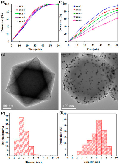 Reusability of the Pt8Co1@UiO-66(Zr) (a) and PtCo/UiO-66(Zr) (8:1) (b) in the hydrogenation of nitrobenzene. TEM images and corresponding particle-size distribution histograms of the recycled Pt8Co1@UiO-66(Zr) (c,e) and PtCo/UiO-66(Zr) (d,f) after being used five times. Reproduced with permission from [63].
