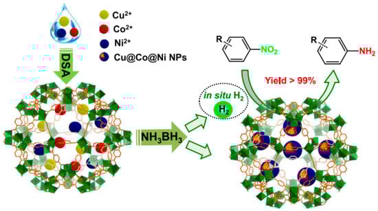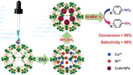 Preparation procedure of CuNi@MIL-101(Cr) by the DSM and its use as catalyst for a cascade reaction involving dehydrogenation of NH3BH3 and hydrogenation of nitroarenes. Reproduced with permission from [64].