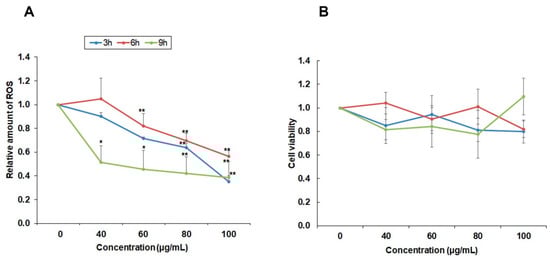 Effect of YLE on ROS formation of HepG2 cells. (A) Antioxidant effect of YLE on HepG2 cells after 3 h, 6 h, and 9 h. Data are expressed as averages ± S.D (n = 3); * p < 0.05, ** p < 0.01 vs. control group. (B) Effect of YLE on cell viability. Data indicated no specific change between treatment groups and the control group after indicated times (3 h, 6 h, 9 h).