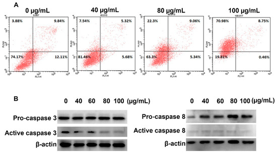 To clarify the mechanism of YLE on inducing cell death in HepG2 cells, we stained the YLE-treated cells with Annexin V/PI after 24 h exposure and measured the fluorescence by flow cytometry. The percentage of each subpopulation of cells is described in Figure 6. We found that YLE induced the loss of cell membrane integrity, which was indicated by the increase in numbers of PI-positive cells. The proportion of only the PI-positive cell population treated with 100 µg/mL YLE was approximately 20-fold higher than the one in the control group. Additionally, YLE did not trigger caspase activation or cleavage of caspase proteins, such as caspase 3 and caspase 8. These data suggest a necrotic mode of cell death induced by YLE.