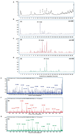 TIC in the positive mode of YLE (A). EIC of m/z 465.1761 (±10.0 ppm) [C23H28O10 + H]+ (B); EIC of m/z 449.1812 (±10.0 ppm) [C23H28O9 + H]+ (C); EIC of m/z 433.1862 (±10.0 ppm) [C23H28O8 +H]+ (D). Product-ion chromatograms of compound 1 (E), compound 2 (F), and compound 3 (G).
